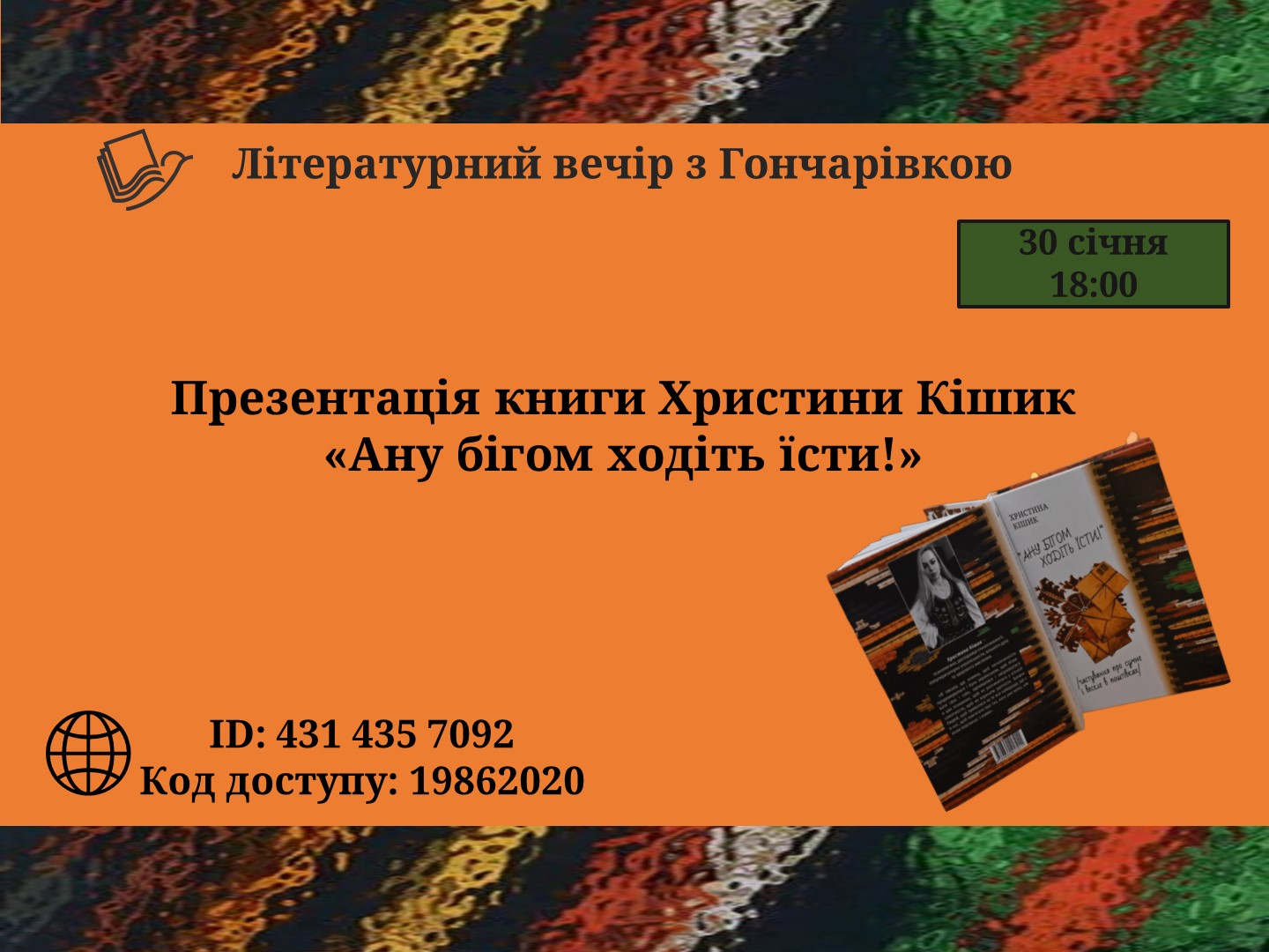 Запрошуємо на затишний «Літературний вечір з Гончарівкою», що відбудеться у п’ятницю, 30 січня, о 18:00. На вас чекає презентація книги Христини Кішик «Ану бігом ходіть їсти». Книга складається з так званих «поштівок» – невеликих за обсягом, але надзвичайно насичених за змістом текстів, народжених із прожитого досвіду в координатах родини, друзів і знайомих. У них – пам’ять роду, колективний і особистий досвід українців, де тісно переплелися імперські кривди, війни, важка праця, родинні втрати й голод.